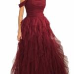 Romántico y lleno de encanto, este vestido largo en tono vino tinto es una pieza que roba miradas. Con un corpiño drapeado estilo palabra de honor y delicadas mangas caídas tipo off shoulder, resalta los hombros y el escote con una feminidad clásica y elegante.