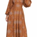 Estilo bohemio con un toque sofisticado. Este vestido midi en tono café canela resalta por su estampado geométrico con flores estilizadas, creando un look cálido y moderno ideal para la temporada.